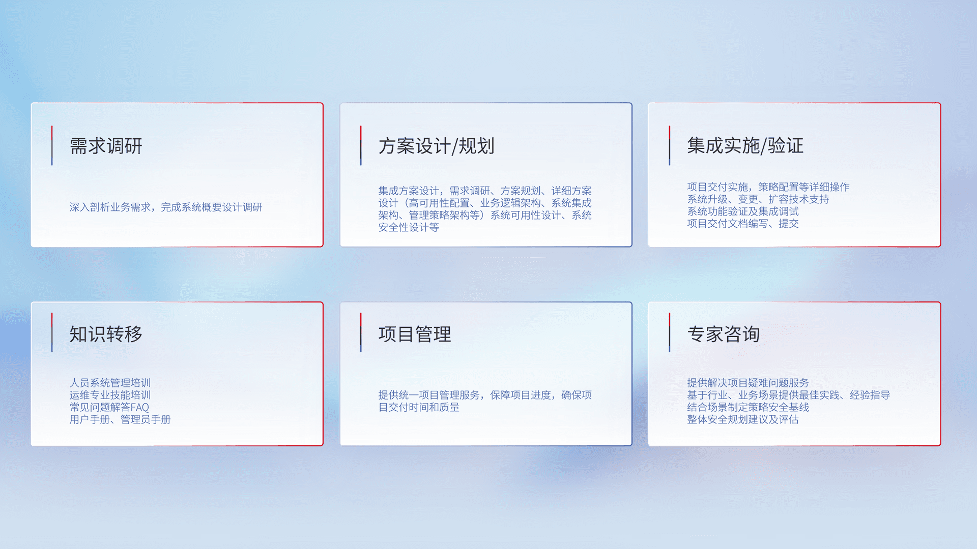 针对客户行业特性,,,将宏观的安全战略和需求,,通过专业的交付服务,,,实现项目落地,,,为客户提供标准规范的集成交付服务。。。。